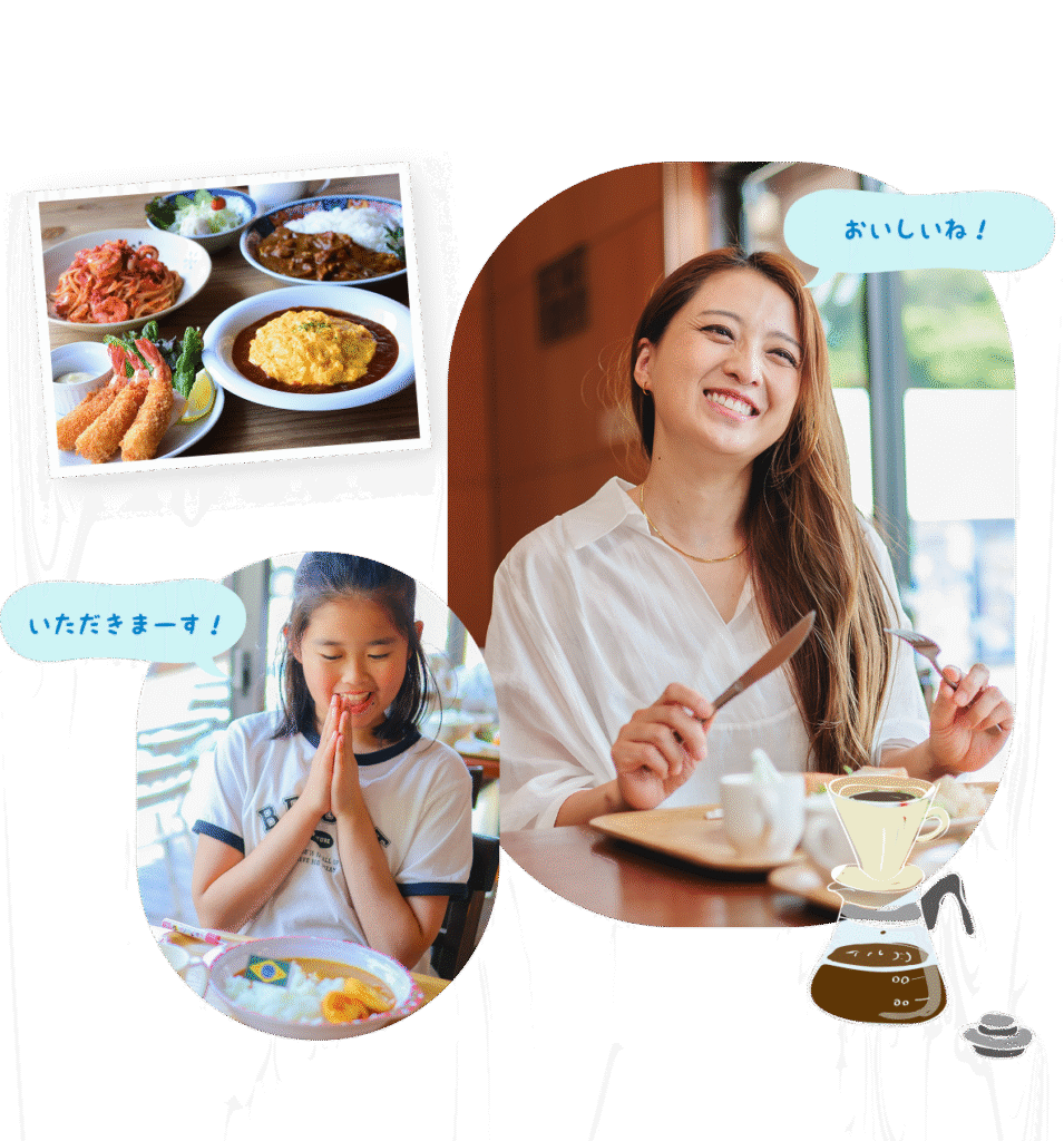 朝9時からはボリューム満点のモーニング、お昼には季節の味覚を詰め込んだランチメニュー、午後にはこだわりのスイーツをご用意してお待ちしております。