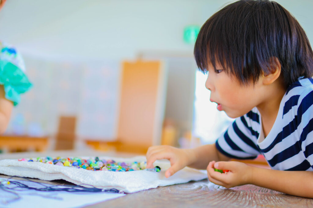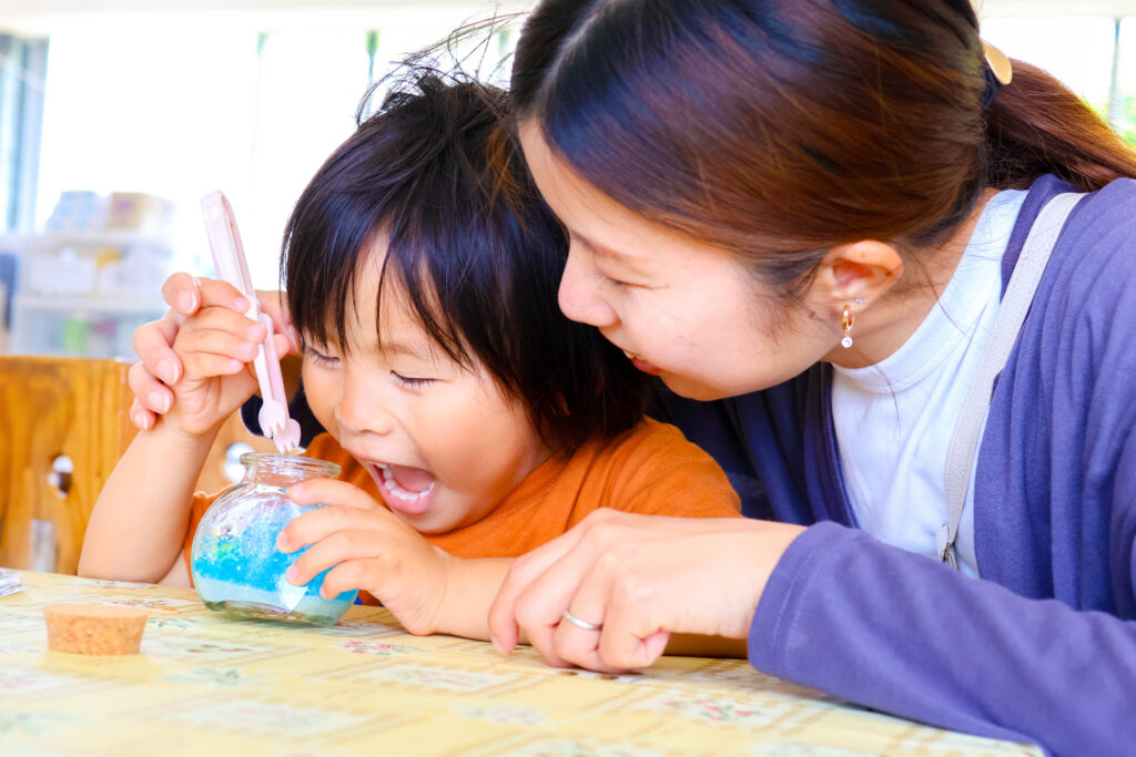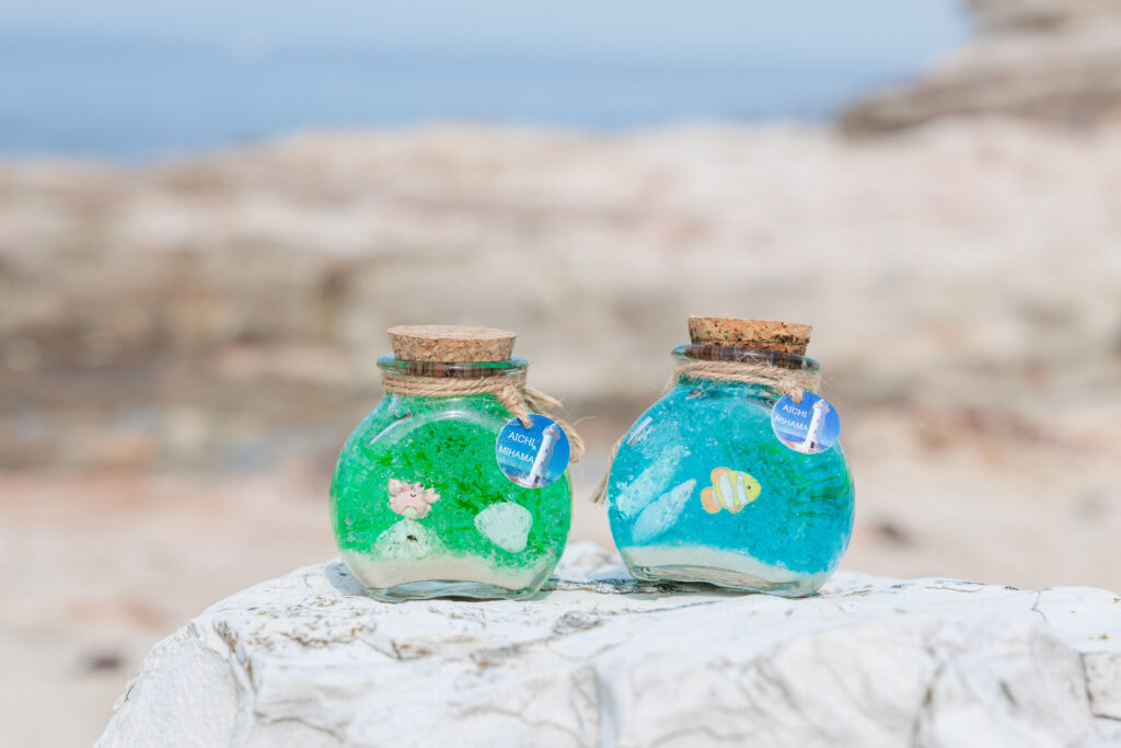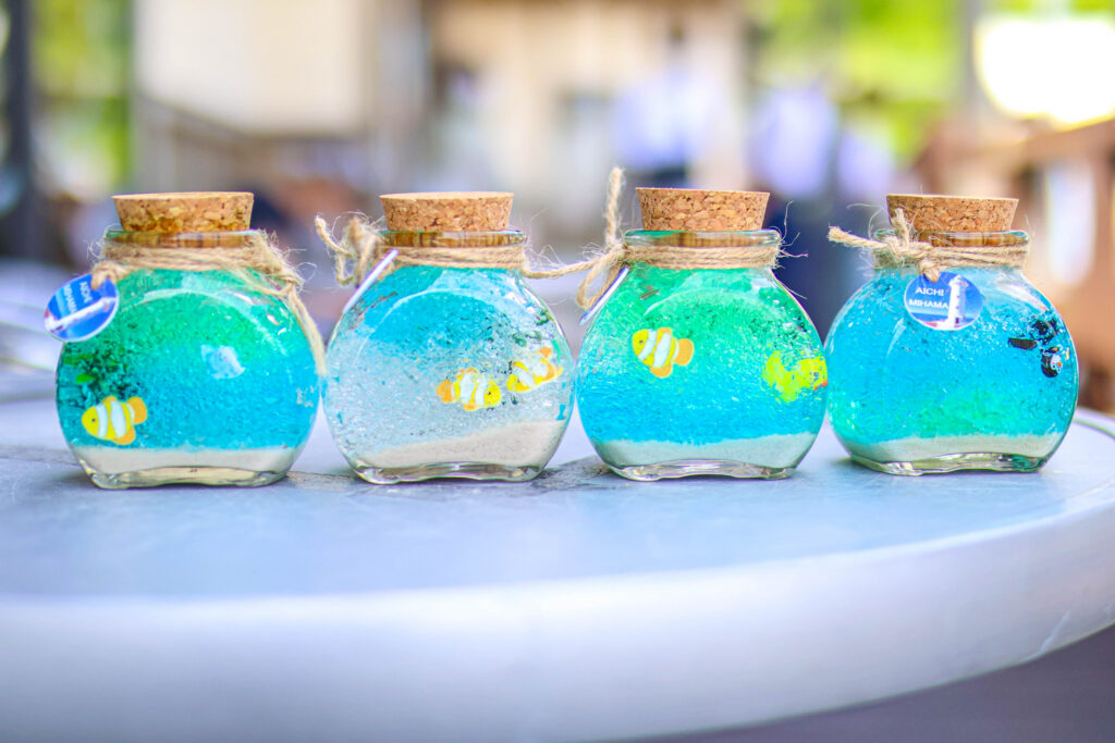 色とりどりの貝殻、さらさらの砂、きらめくビーズなど、豊富な素材の中からお気に入りを選んで、透明なガラス瓶に詰めていきます。